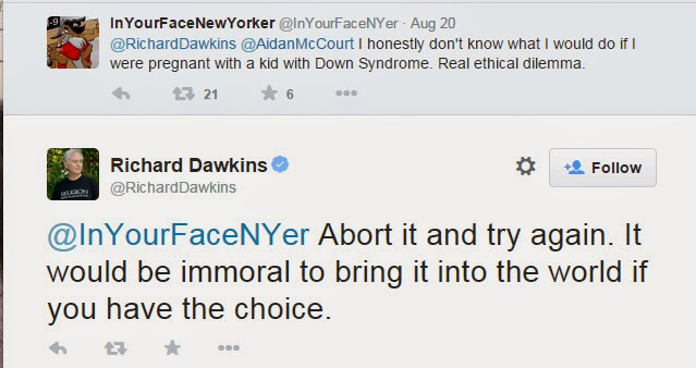 "Abort it and try again," Dawkins tweeted in reply. "It would be immoral to bring it into the world if you have the choice."