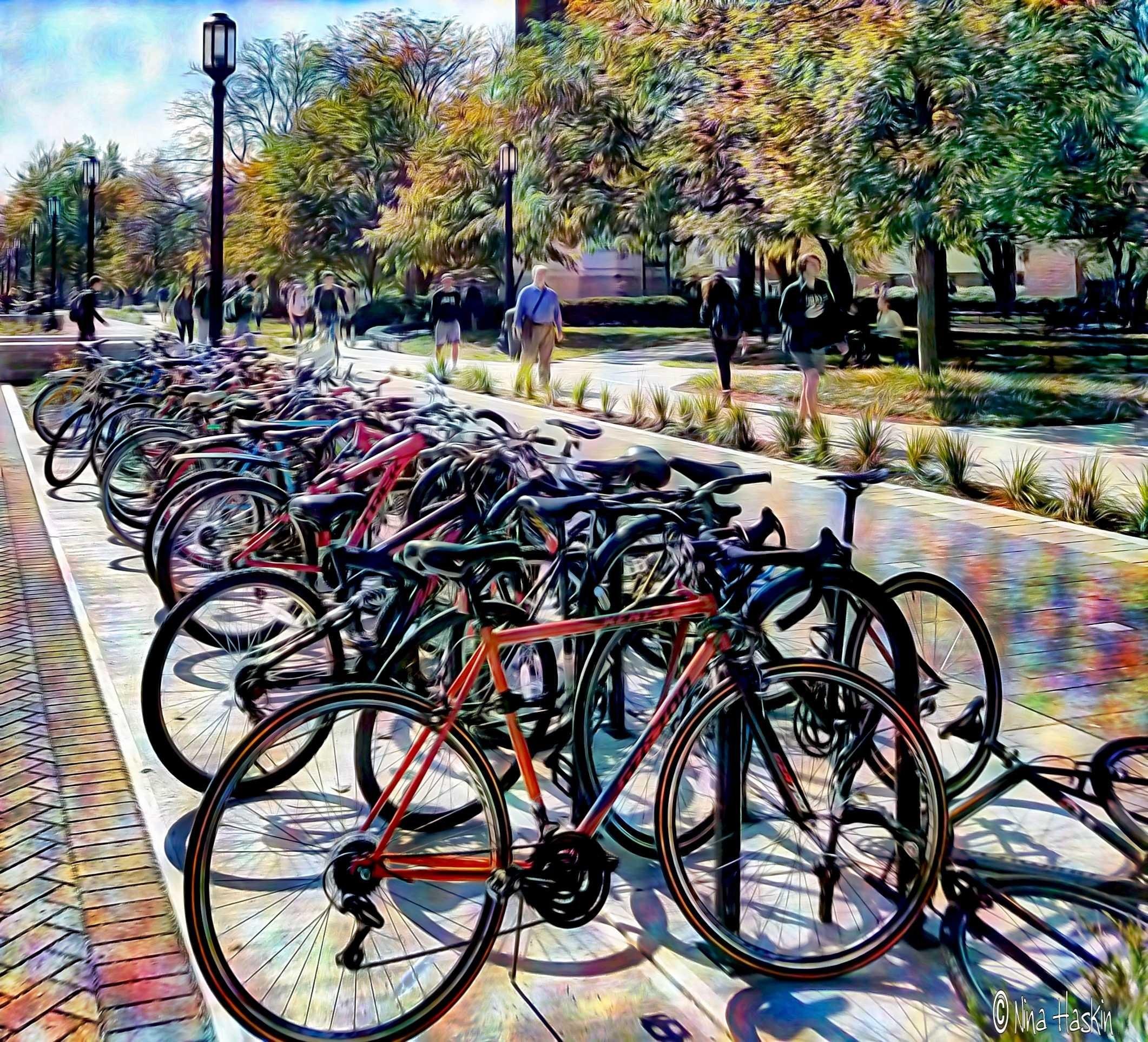 Her stylized shot of bikes parked on a college campus is colorful and interesting.