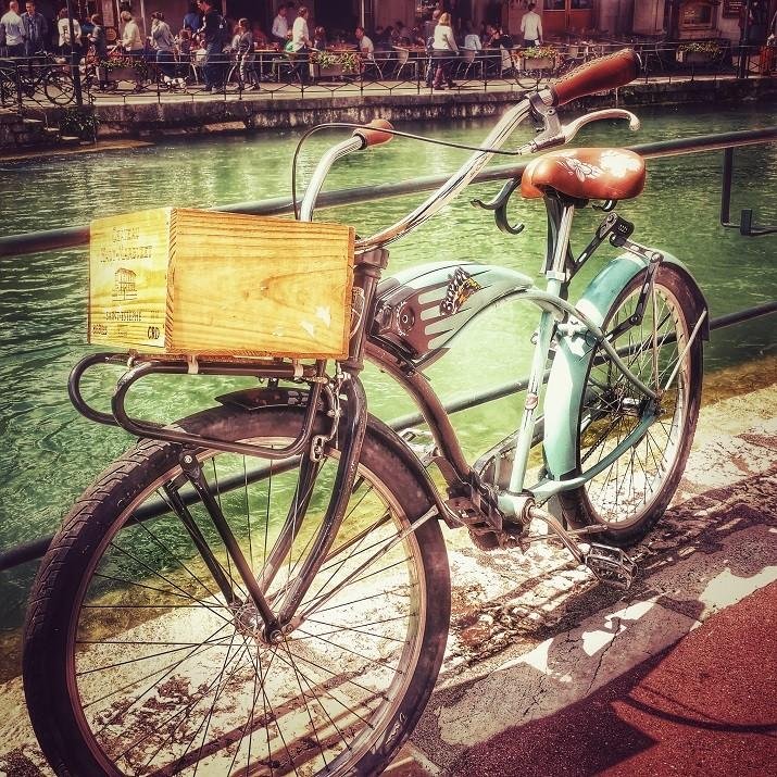 Interesting bike, and the canal makes a nice background. The wine case basket is a nice detail, but it would be even better if it were still full of wine.