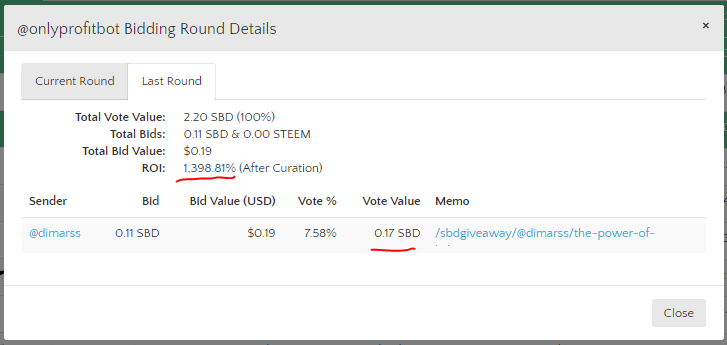 The issue is during the bidding round your bot displays min/max ROI as - 20 / None but once the bidding round ends it doesn't give the percentage vote based on what is advertised. The max ROI looks to be around 20 % but I haven't done the math.