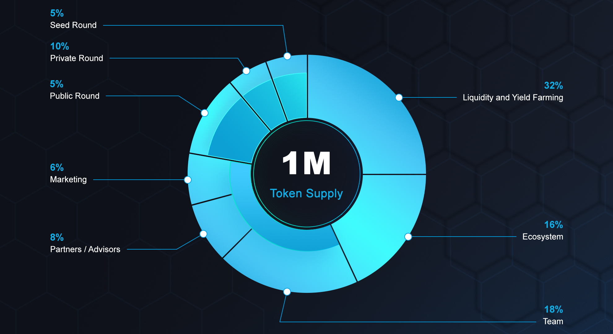 Team - Cliff 06 months. 12.5% unlocked on every quarter.Partners & Advisors - Cliff 01 month, linear vesting of 25 months.