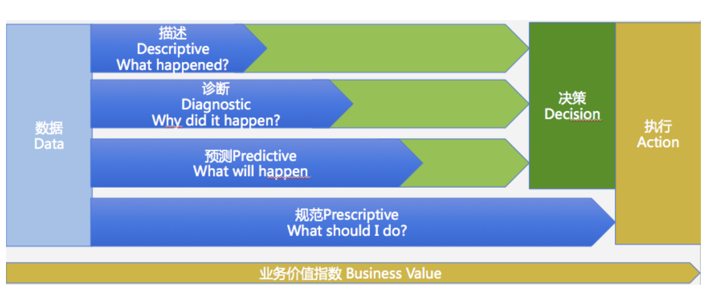 Past practice has shown that more than 75% of data analysis scenarios are descriptive analysis. Most of the data warehouses and BI systems that have been established by enterprises can be attributed to this scenario. Daily operation reports, operational dashboards, cockpits, etc. belong to this scenario. The realization of this kind of application. Diagnostic and predictive analysis applications are more used in specific scenarios such as recommendation and operational abnormality analysis. The scope of use is small and the effects are uneven. The standard analysis scenario directly opens up analysis and execution, which is currently mainly reflected in more specific business scenarios such as autonomous driving and robots. In a business environment, the value of data requires more than just analysis. The real value is obtained through business decision-making and business execution after data analysis.
