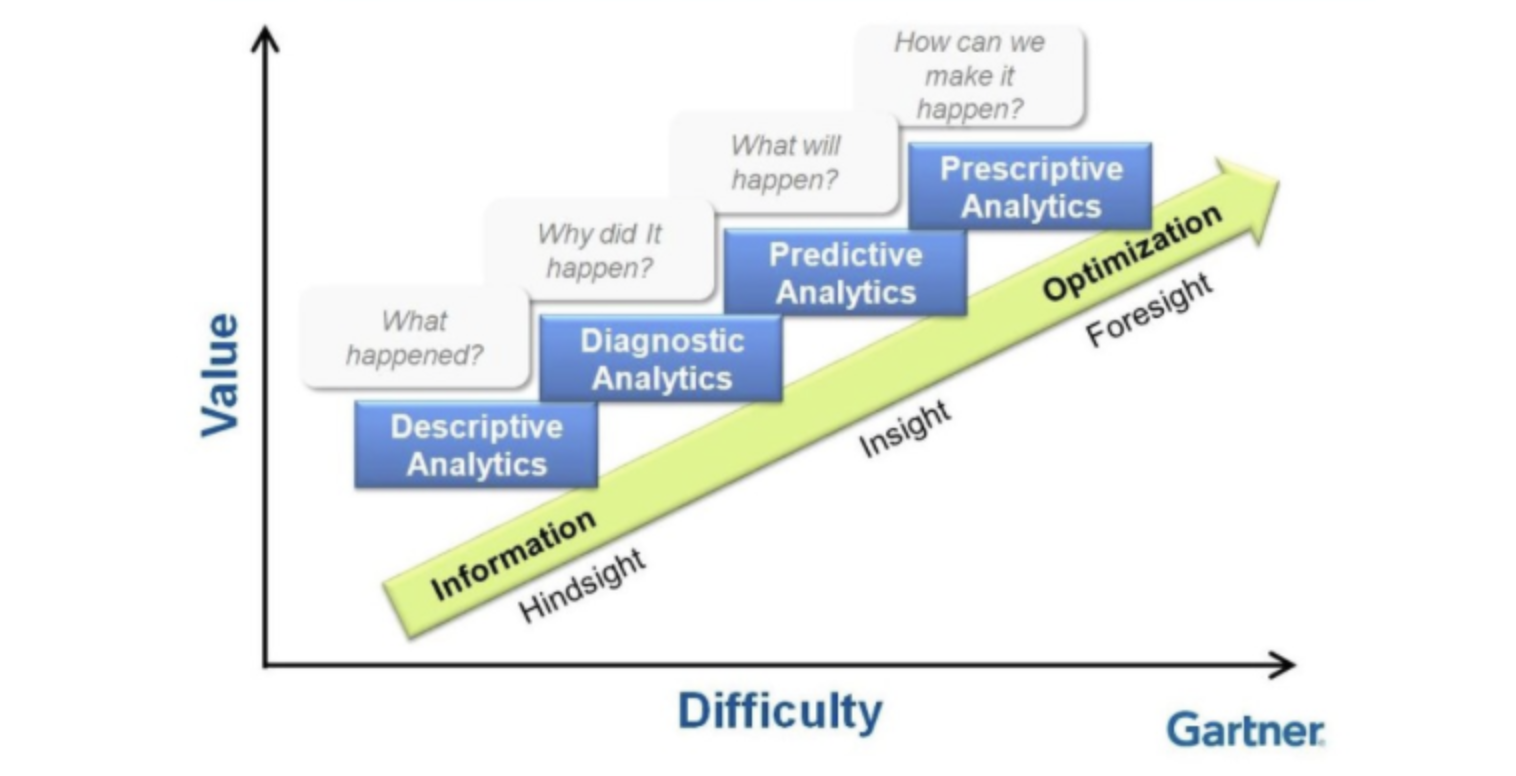 Gartner has a very simple and clear data analysis and difficulty division model, which defines four levels from the difficulty of data analysis to the realization of data value. The definition of these four levels is also very suitable to be regarded as the four milestones in our data value exploration.
