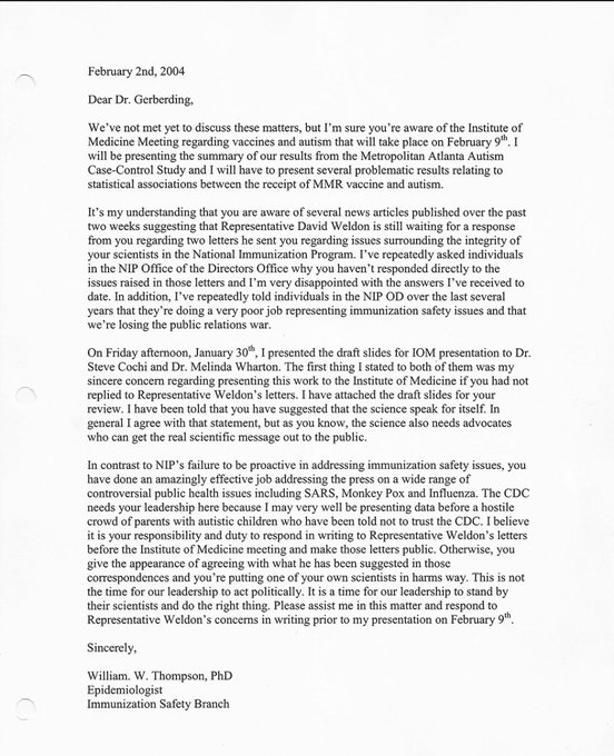 Below is a 2004 letter sent by Dr. Thompson to the then CDC director Dr. Julie Gerberding about the team hiding evidence