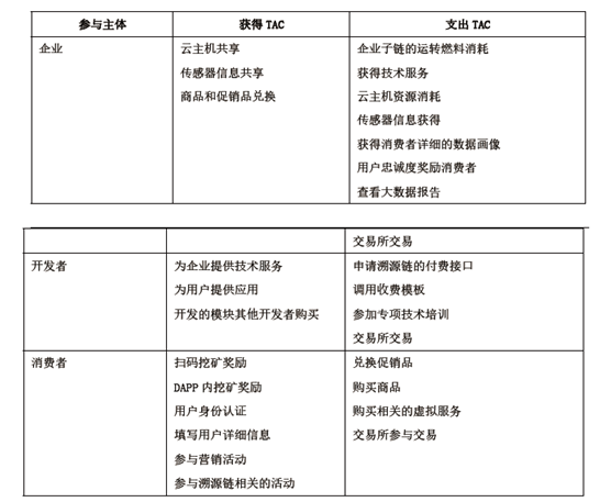 同时溯源链的Token也有丰富的消费方式,溯源链上开发、认证应用、使用链上服务(例如链上转账的矿工费)需要支付或燃烧TAC,具体使用场景如下:
