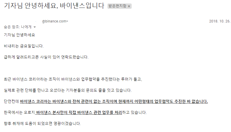 지난달 11일 블록인프레스와 인터뷰를 가졌던 바이낸스의 테드 린 최고성장책임자(CGO) 또한 “바이낸스의 이름을 딴 한국 법인들은 모두 바이낸스와 연관이 없다”며 “바이낸스는 오직 ‘바이낸스닷컴(Binance.com)’ 도메인만 이용한다”고 전한 바 있다.