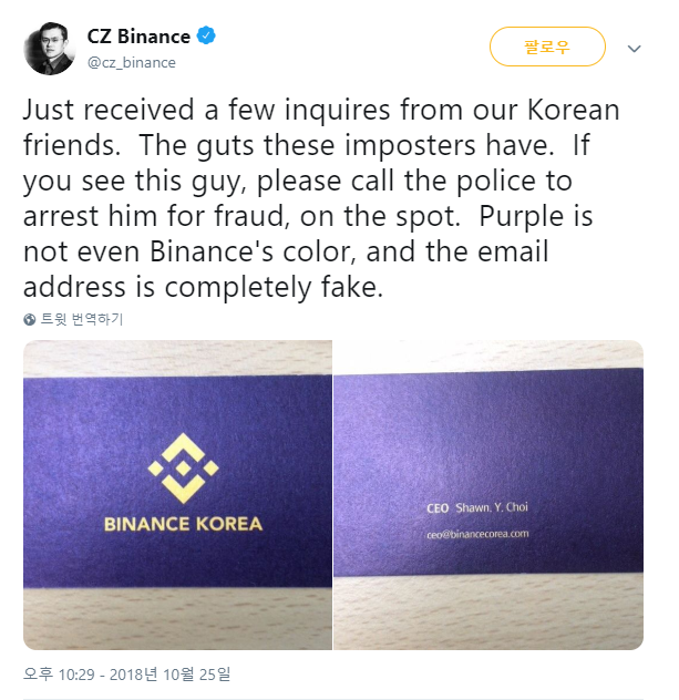 최 대표는 바이낸스 코리아 대표라고 소개하며 국내 업계 관계자들을 만나 명함을 주고 받기도 했다. 자오 창펑 대표는 이에 대해 “만약 이 사람을 본다면, 경찰을 불러 사기죄로 체포해달라. 보라색은 심지어 바이낸스의 색깔도 아니다. 그리고 (명함에 나온) 이메일 주소 또한 완전히 가짜”라며 최 대표의 명함 사진을 찍어 올리기도 했다.
