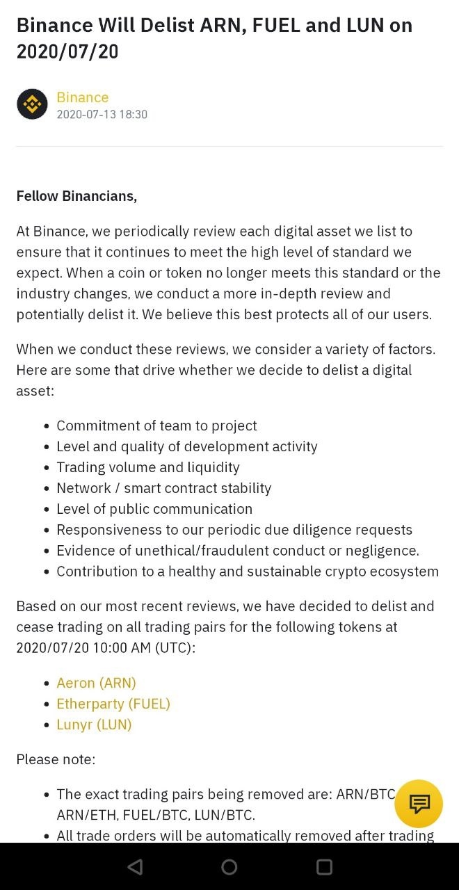 NOTICE- Sell #ARN ,#FUEL & #LUN. Finally BINANCE Has Started Delisting On July 20th 2020.