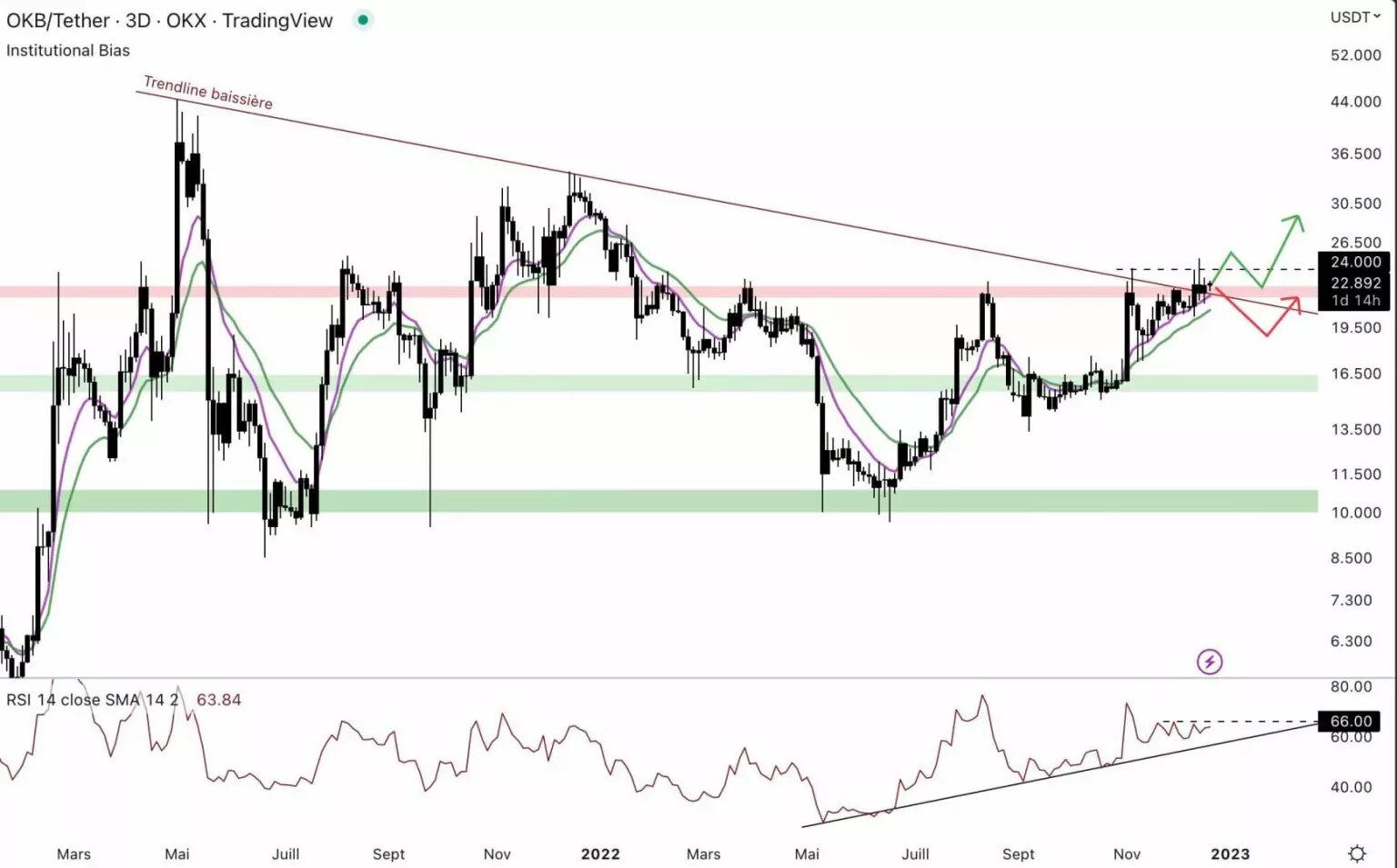 खरीदार इस संपत्ति पर जारी हैं। हालांकि, 24 $ से ऊपर की पुष्टि करने के लिए क्रीस और सैमिट ऊपरी तंत्रांत के साथ बंद करना होगा। कोर्स ट्रेंडलाइन से नीचे है, लेकिन विक्रेताएं अगले सप्ताहों (लाल तीर) में कोर्स को फिर से नीचे पर ले जा सकते हैं। यदि बिटकॉइन उपज की राह को पुनः पात्र होता है, तो OKB भी उससे लाभ उठा सकता है। यदि कोर्स 24 $ को पार करता है और उससे ऊपर बंद होता है, तो अगली उद्देश्य 34 $ होगा।