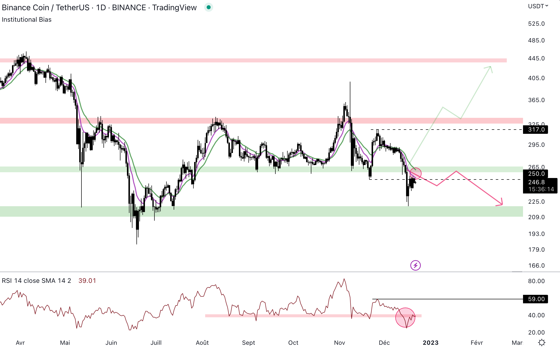 संस्थागत बियास (EMA 9/EMA 18) मंद तंत्रांत में है और आगामी दिनों में संरक्षण कर सकता है। साथ ही, मोमेंटम एक महत्वपूर्ण सपोर्ट स्तर को 40 RSI से टूट दिया है। यह स्तर आगामी दिनों में संरक्षण कर सकता है। जबकि BNB bearmarket के दौरान सामान्यतः सुरक्षित था, तो स्थिति जल्दी ही बदल सकती है अगर खरीदार 215 $ स्पोर्ट स्थान पर होने नहीं हैं।