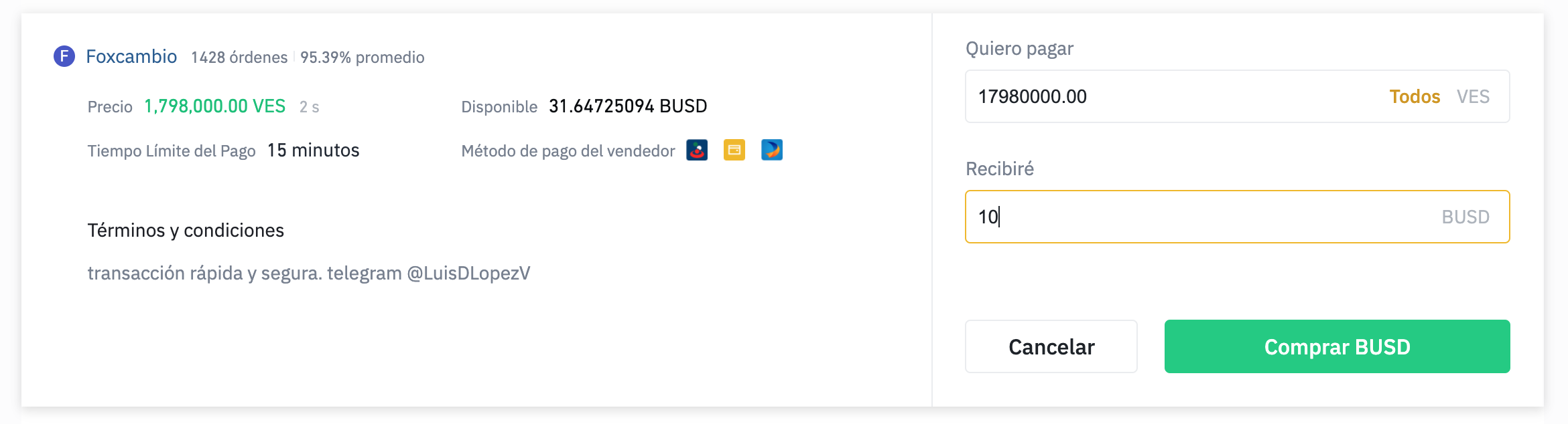 Lo malo es que no tengo Bolívares así que no podré concretarla, pero se entiende la idea. Luego de que hayas hecho el pago y avisado, el vendedor pasará a revisar su cuenta para confirmar y liberar los fondos. Si el vendedor no te responde (lo cual no debería ocurrir si escoges uno con buena reputación), puedes comunicarte con Binance para evalúen la situación.