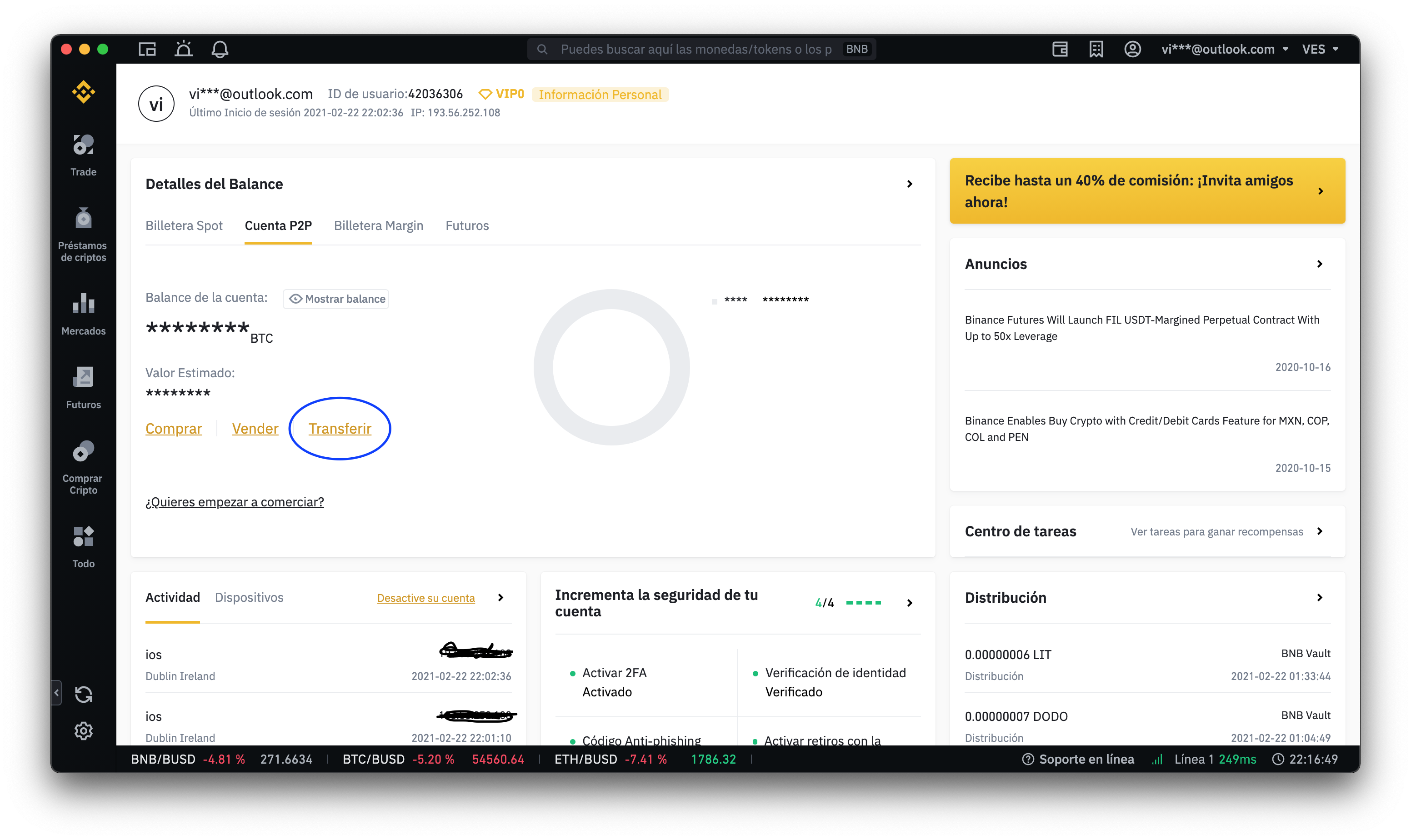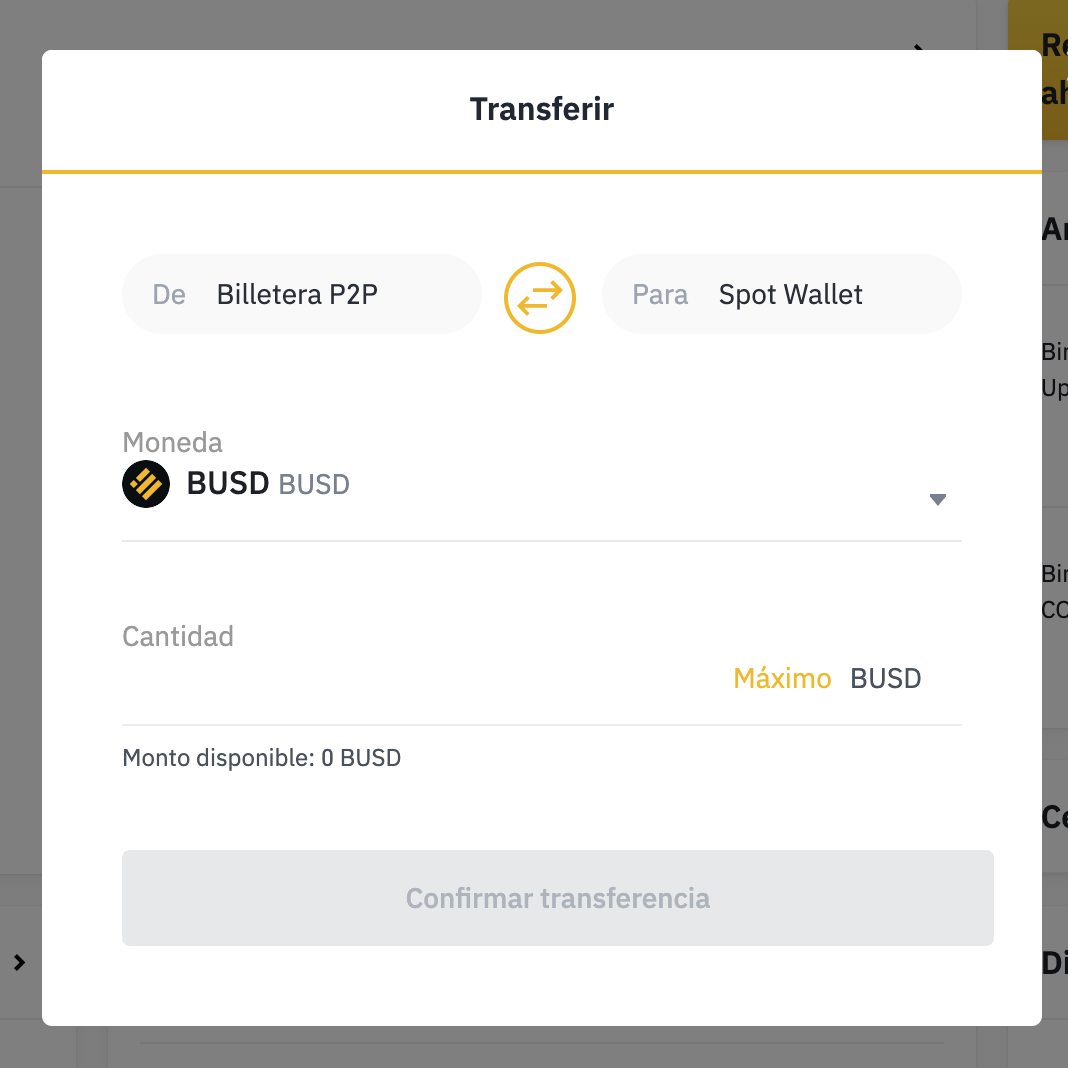 - Haz clic en Transferir y asegurate que arriba diga de billetera P2P para Spot.
