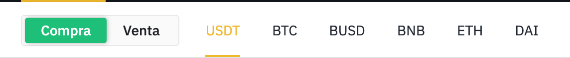 En la vista P2P podemos encontrar una opción para comprar/vender seguido de las monedas USDT, BTC, BUSD, BNB, ETH y DAI.