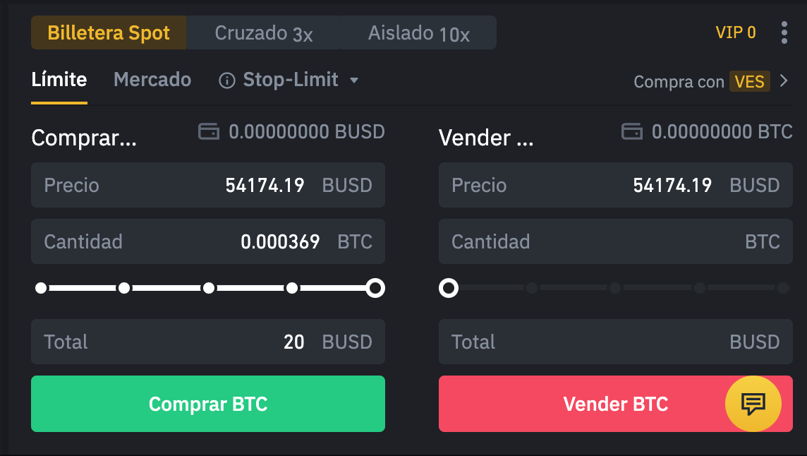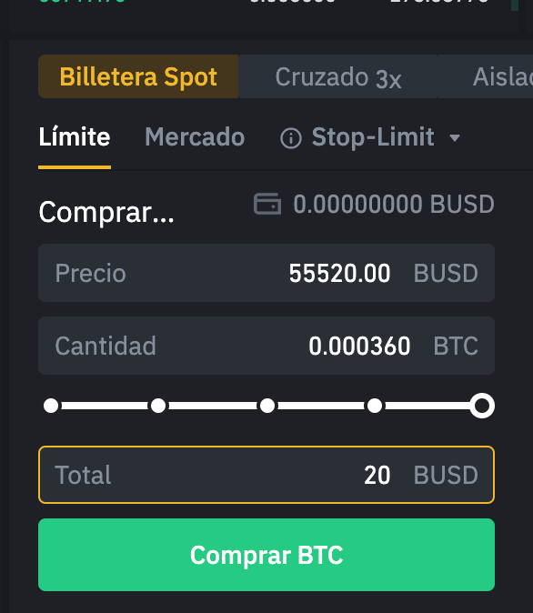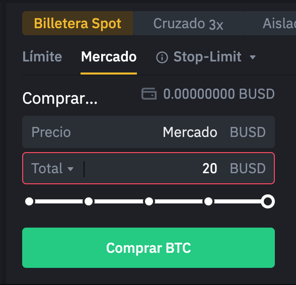 Si no quieres complicarte la vida, y comprar Bitcoins al precio del momento, puedes hacer clic en la pestaña Mercado, colocar la cantidad de Bitcoins quieres comprar o el total de BUSD que quieres cambiar y hacer clic en “Comprar BTC”.