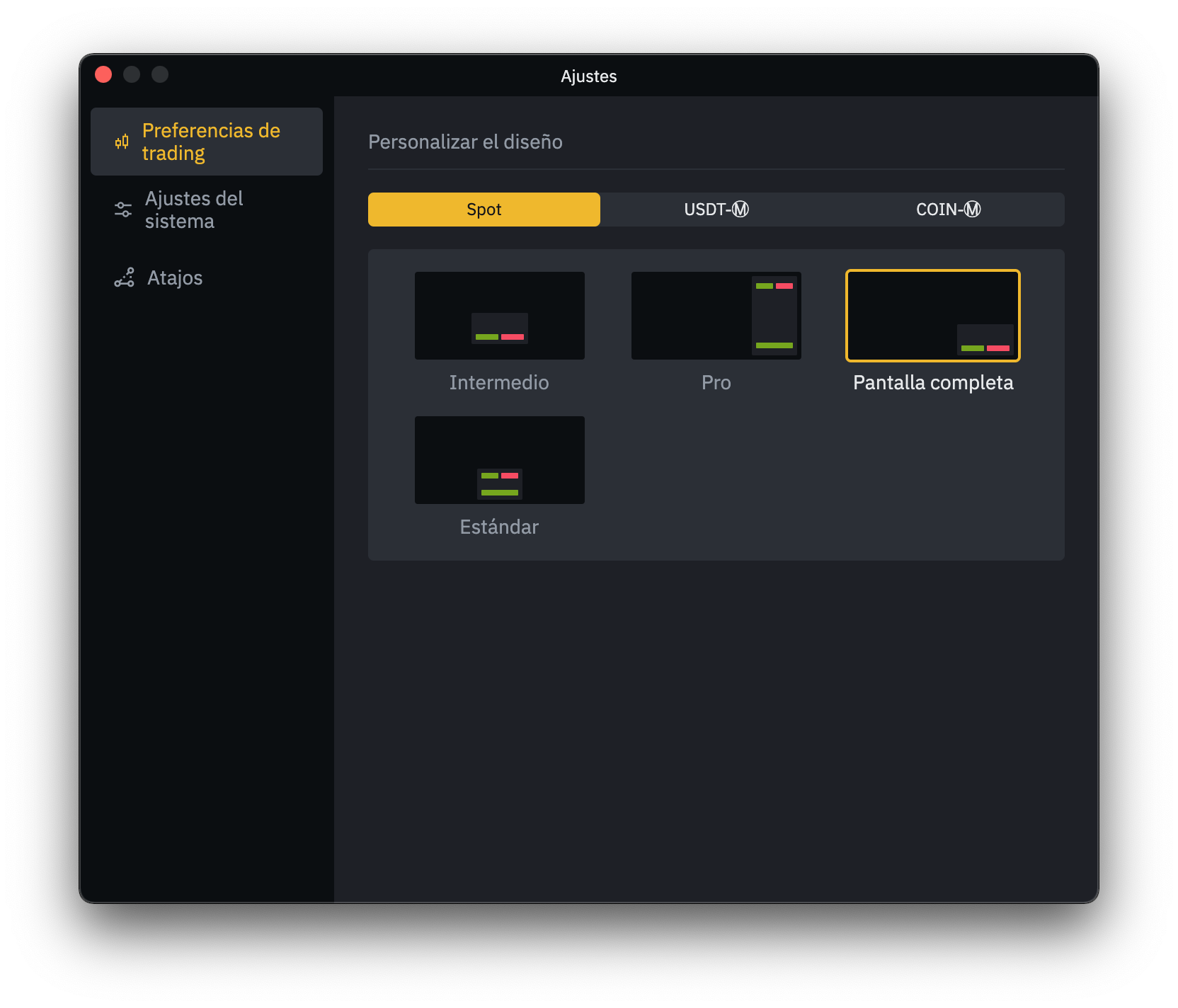 La pantalla inicial puede variar, pero sugiero irse a las preferencias de Trading en los ajustes de la app y seleccionar la vista “pantalla completa”