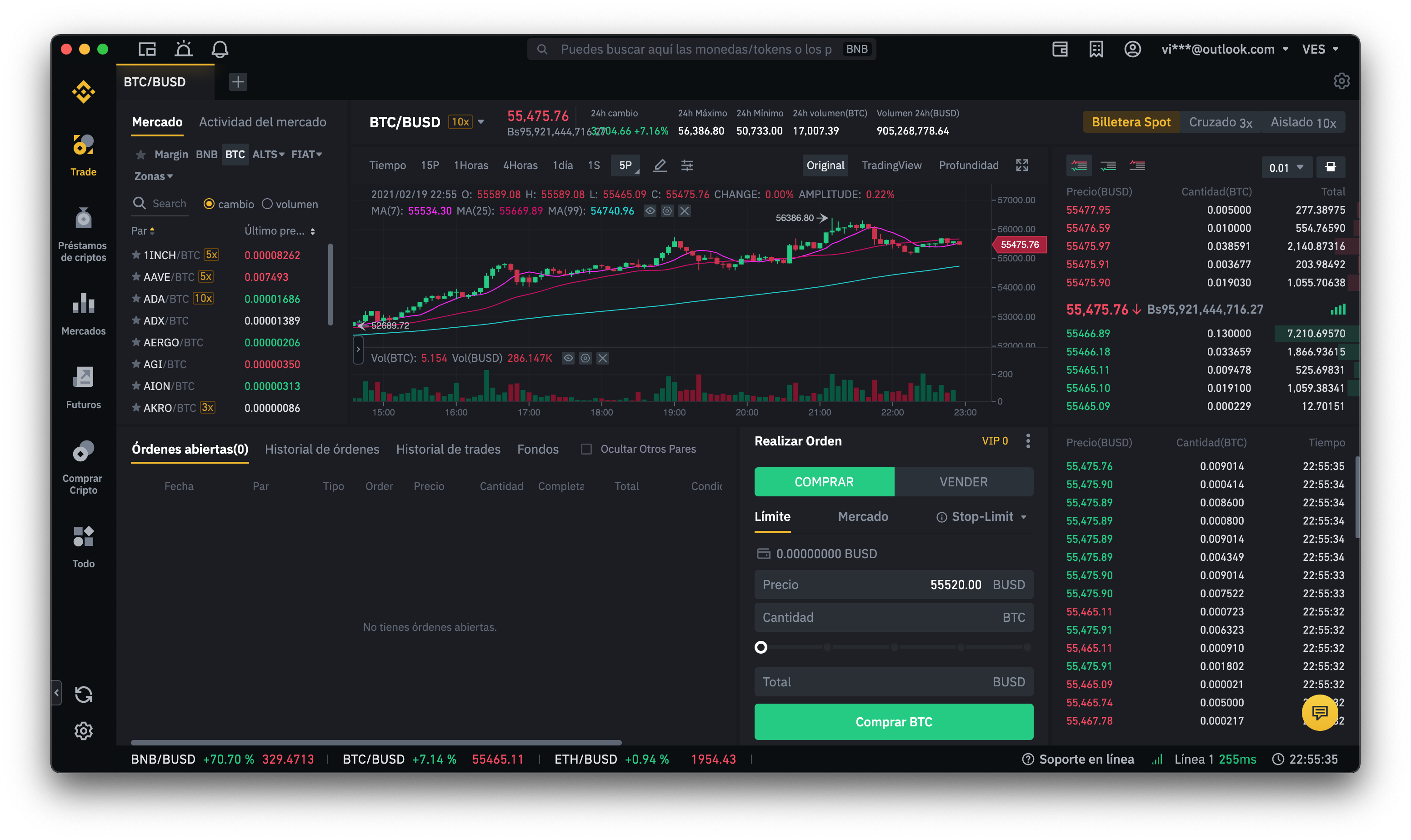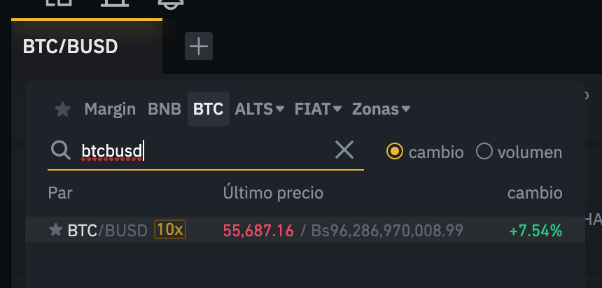 En la parte superior nos aseguramos de que la pestaña sea BTC/BUSD (o BTC/USDT en caso de haber comprado esta). Si nos aparece algo diferente, haz clic en la cruz para añadirla y escribe btcbusd.