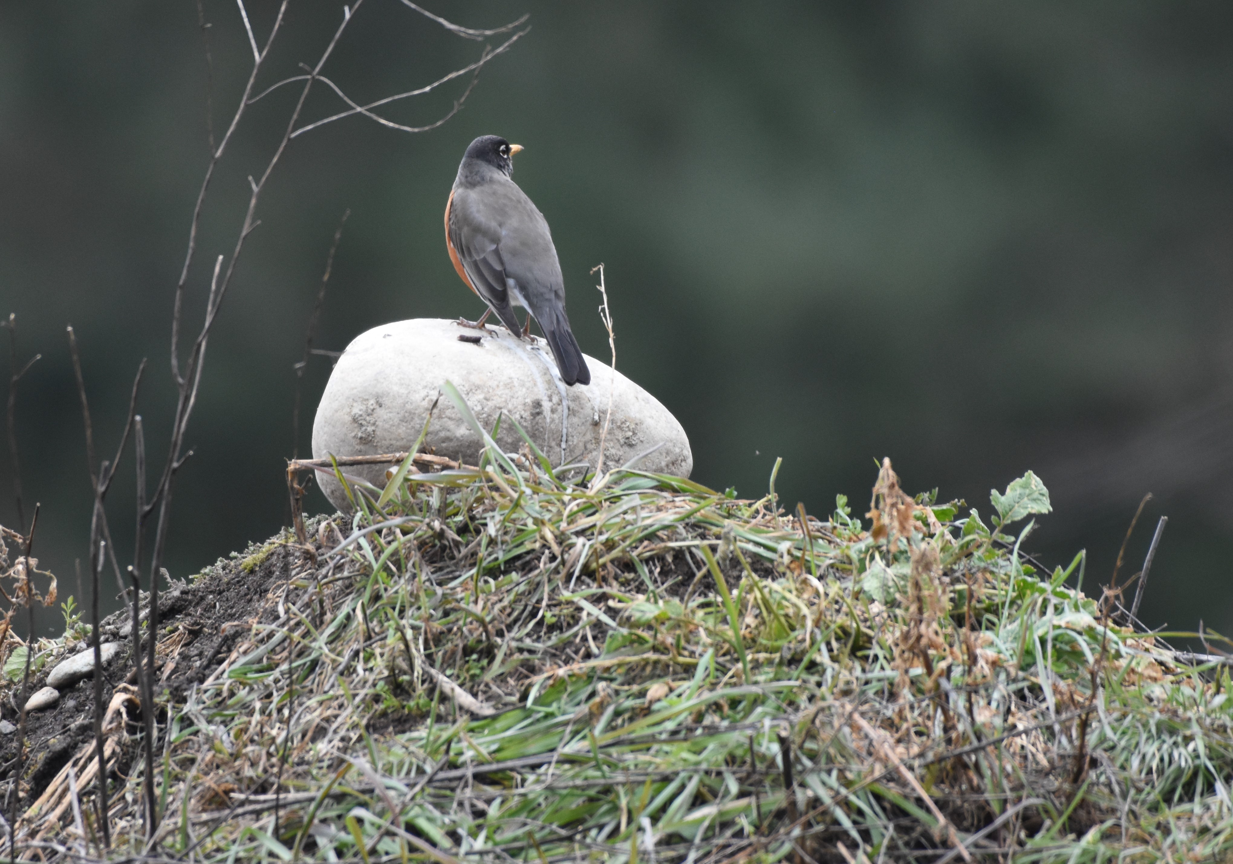 This American Robin Turdus migratorius sang from the top of a large pile of gravel, playing King of the Mountain.