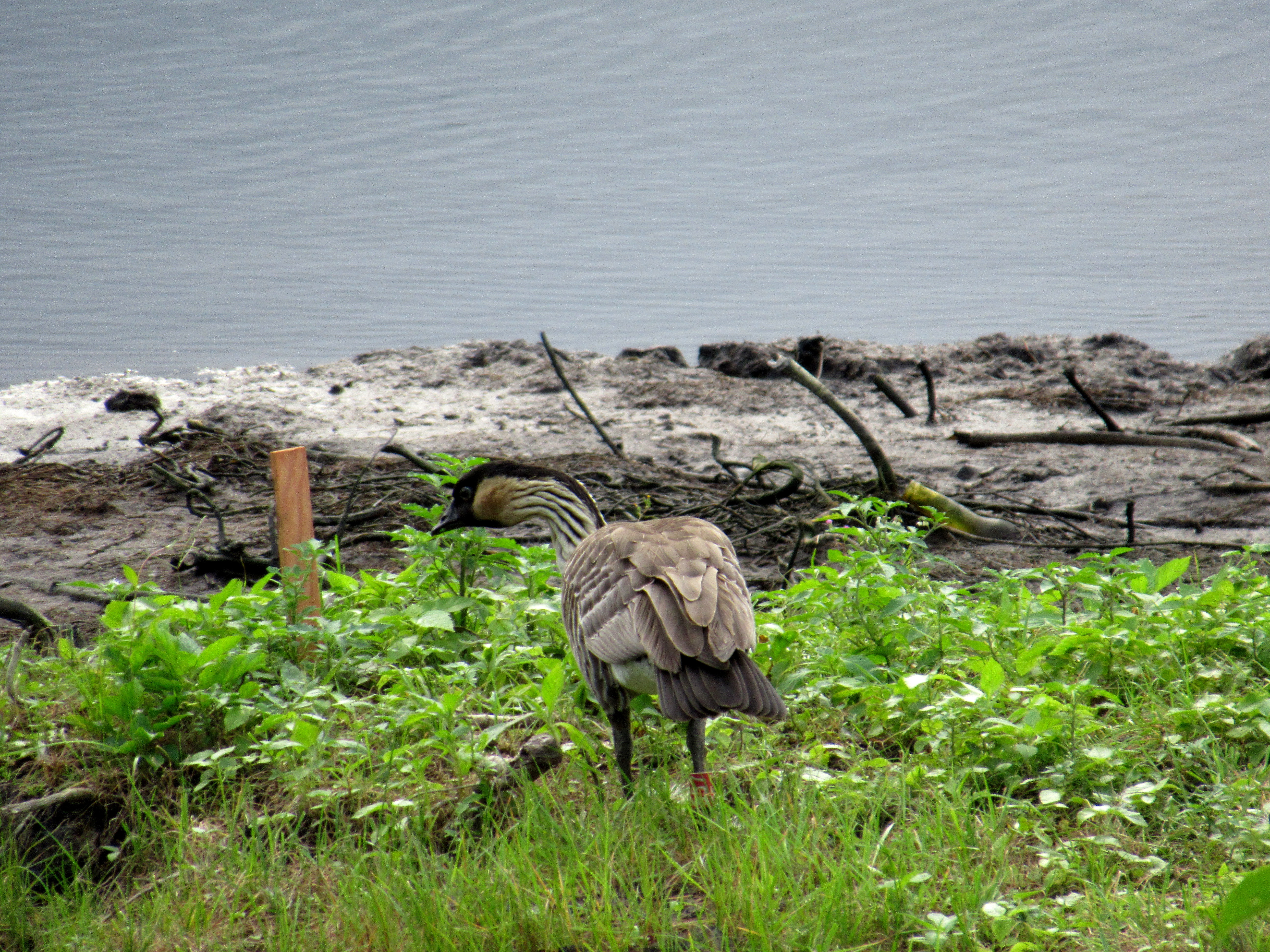 The Hawaiian goose is known locally as the nene or nēnē (pronounced nay-nay after one of the sounds it makes.) It is the rarest goose in the world and an unusual one. Believed to have evolved from Canada geese that, um, got lost, it doesn't migrate, doesn't fly much, and doesn't swim much, unlike most geese. And while most geese have webbed feet for swimming, the nene's have longer toes, less webbing and thicker padding, adaptations for walking on lava fields.