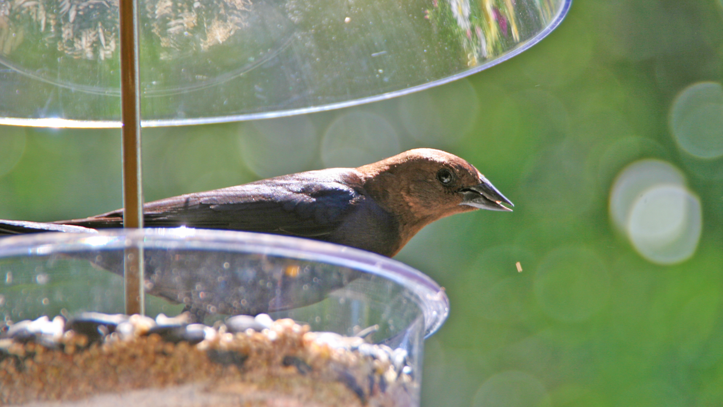The feeder she is dipping into right now is the X-1 Droll Yankees Seed Saver®. I have it up for the chickadees and finches, although I did have a brown-headed cowbird (Molothrus ater) visit at least once: