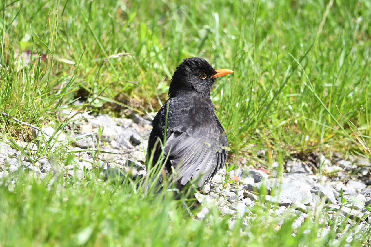 In summer the male common blackbird is visiting my garden from time to time and looking for rain worms and other insects that hide in the grass. Since my garden has a lot of natural elements like parts that I don't mow and some parts with sand. Birds like it very much since they can find insects there and can also use the sand as a repellent for parasites. The common blackbirds like to search for worms in the grass and I already observed it several times that they found a big worm and flew away. Unfortunately the neighbor has a cat so I am still a bit in two minds about preparing a feeder and some water for the birds. I have to find a nice model that is catproof and save for them.