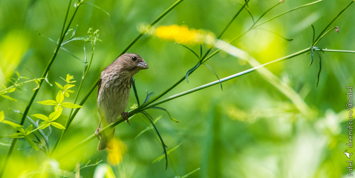In the lower photo you can see the female, she is poorly colored, and in general she looks like it can be confused with an common sparrow.