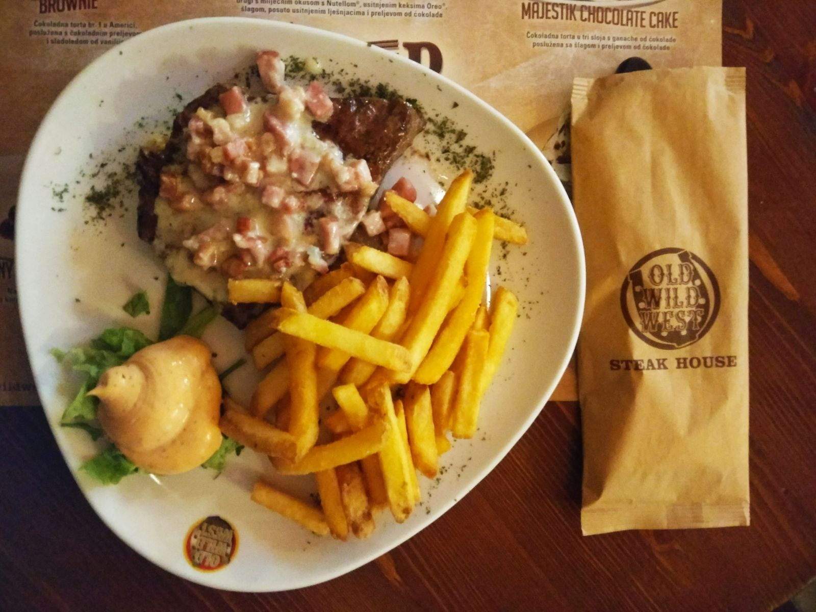 Top quality grilled rump steak with gorgonzola cream and crunchy bacon served with french fries and Old Wild West dip
