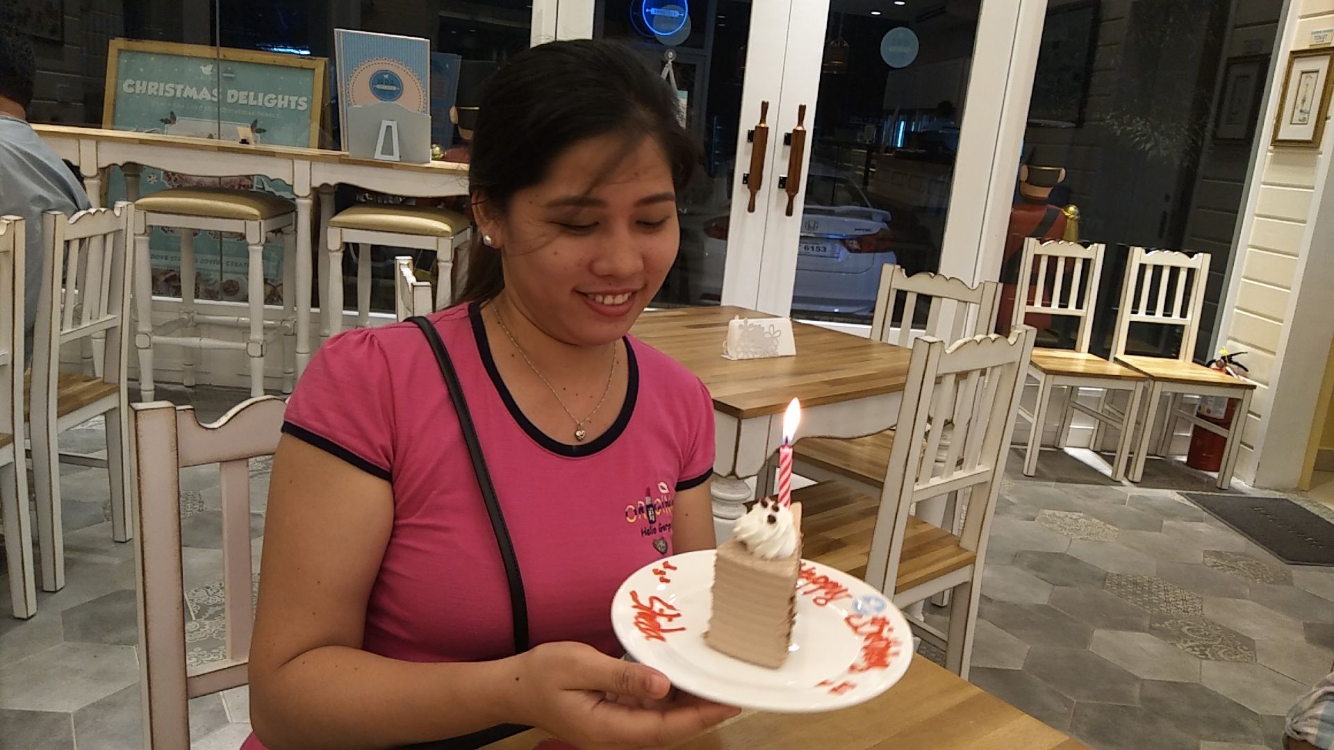 But the treat was not end here. We go together to IT park to meet her friend for a while and then after, walking around, until she wanted to visit her favorite cake shop which is the “10 D.C Dove Street Confectionery” without knowing that her other friend was already there and preparing a cake. I was so shocked!!! And really surprised when 2 staffs of that cake shop, my cousin and her friend singing a Happy Birthday to me! While they gave me a slice of cake with candle. It was overwhelming and feels me special, even though I don’t have a preparation at home; I’m still blessed because of my cousin.