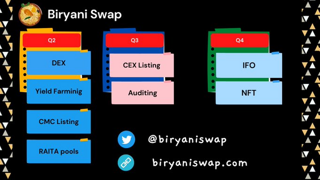 As depicted above and as indicated on the official website Biryani Swap, Biryani Swap is a decentralized exchange (DEX) running on Binance Smart Chain #BSC with Yield Farming and Raita Pools, spin feature that let you earn and win tokens.
