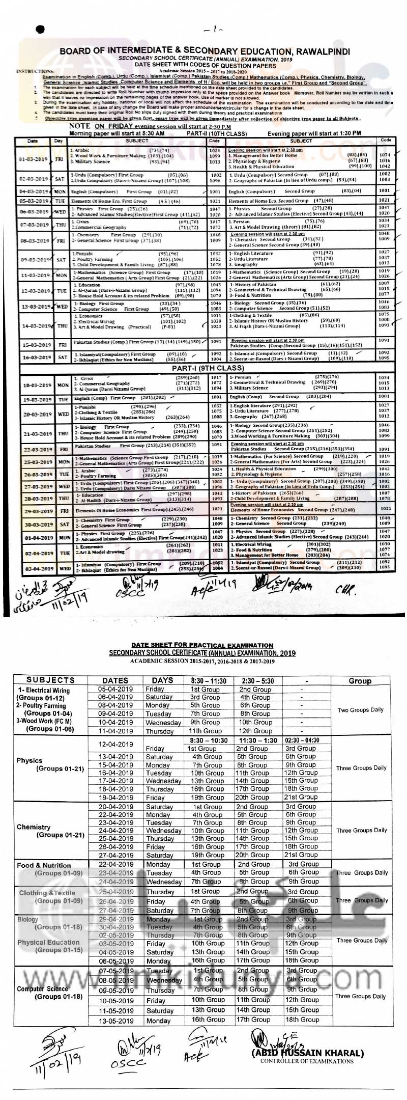 Biserwp 9th class date sheet 2019