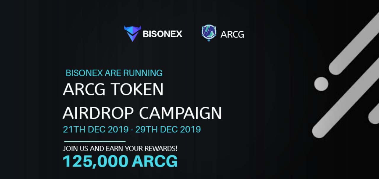 [reward activity] : Bisonex will start to register new users at 8am on December 21, 2019, and receive 100 ARCG ($9) rewards after passing KYC real-name authentication, a total of 125,000 ARCG, first come, first served, until delivery. Up to 1,250 new KYC users will terminate the reward program.