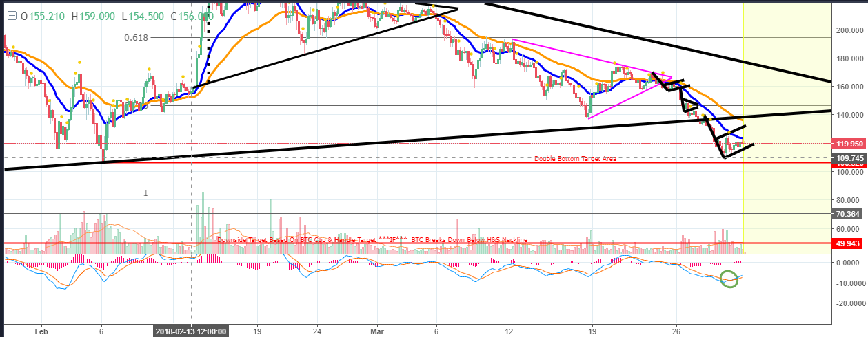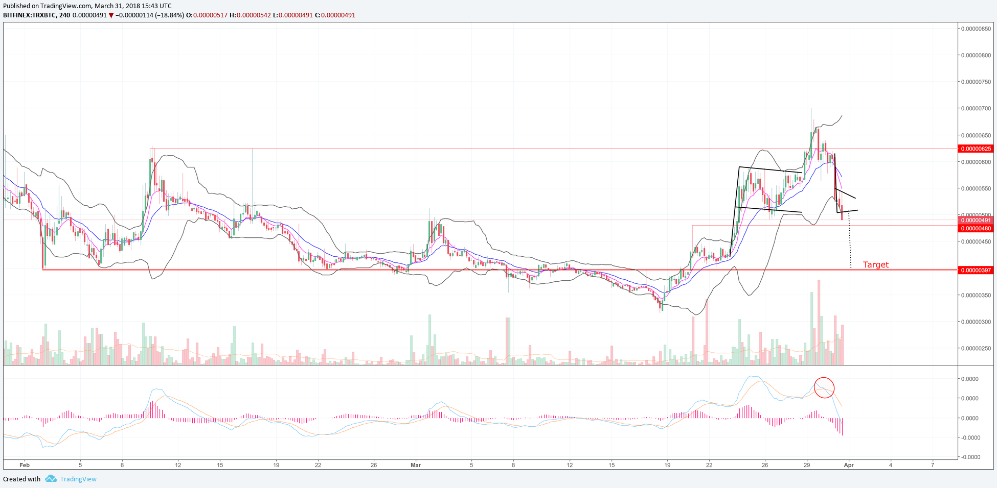 Welcome to this update a nalysis on TRON! Let's get it! Looking at the four hour chart, you can see that TRX/BTC -17.85% has rallied out of the bull flag , but it wasn't able to hold above the overhead resistance at 625. Now, Tron -6.06% has fallen dramatically, forming a bear flag consolidation, as the momentum expands to the downside. You can see that the MACD has just crossed below the zero line, which is a technical sell signal, while Tron -6.06% is printing a bear flag . Volume is declining, which confirms the consolidation inside of the flag. However, the majority of the recent volume has been overwhelmingly red. Furthermore, you can see that the big red reversal bar of 3/29 had very high sell volume associated with it. That's an indication of a major rejection of that level, so we can assume that further downside remains. Additionally, you can see that the candles inside of the flag body itself are very bearish — printing increasingly taller upper wicks. That's an indication of mounting sell-side pressure inside of the bear flag . With all of these negative indications, we can expect a breakdown of the bear flag to occur. Light support exists around 480, with major support around 397, where the downside target rests.*