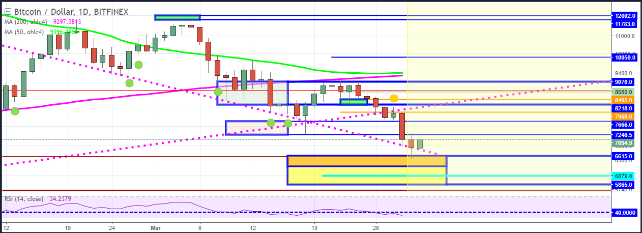 As we pullback from the 6615 resistance level we are looking at two levels of importance. The 7200 level is the level that needs to be broken for us to turn bullish. This level needs to be held. At this point I almost want to see two closes on the 12 hour chart to confirm.