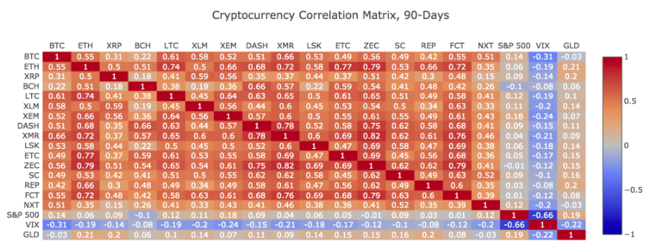 To answer the question if beaten will decline in the next stock market crash will go up or will behave as gold so answer those question will help to figure it out the correlation between Bitcoin S&P 500 and gold while many many attempts have been made to qualitative correlate cryptocurrency market even imply causation a big no-no in quantitative analysis relatively few attempts have been made to quantify the relationship asides from few outdated articles I have found something interesting the best resource I have been able to find the subject was silvered data a free cryptocurrency data visualization tool among other visualizations they have cryptocurrency correlation matrix which shows the z-score and peace core of correlations between the visual assets