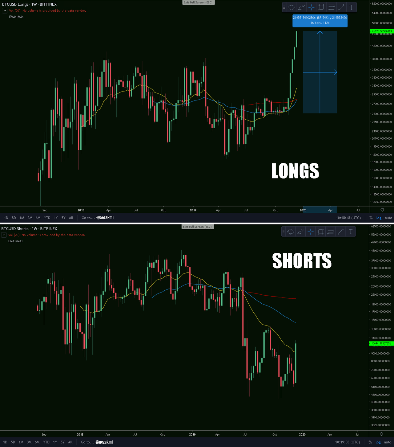 ....and now to the strange part. It seems that the 'Long' contracts on Bitcoin are soaring this period, reaching all time highs. The 'Shorts' are also increasing, responding to the current market, which is quite common - but under no circumstances like the Longs do. What's going on? Is it the whales anticipating a huge spike in Bitcoin's price?