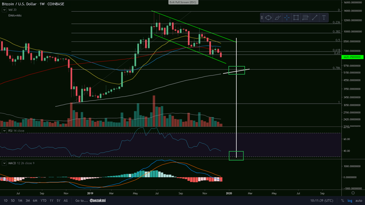 With our most recent drop, we broke again the Fibonacci Golden Pocket support (0.618 - 0.65, Fib. on the whole 2019 movement) level and continue our downtrend in the descending channel. As I stated in my previous posts, I still believe that we're going to revisit the 200w MA, currently at ~5000$. I'll be looking to enter a long position on BTC when reaching the green rectangle area: the price approaching the 200 weekly MA and the RSI bouncing at the lower reference line or even enter the oversold area, like in 2014.