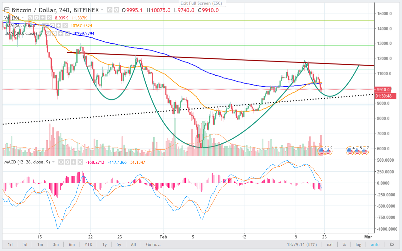 Looking at the 4 hour chart we can see that BTC has negated the bull flag that I described in my last post, it however tried to bounce back around the levels of previous low of $10300 but bears again proved to be stronger by pulling BTC back below $10300 and forming a small head and shoulders pattern on the chart which coupled with bearish MACD brought back the sell side momentum back in the market initiating a further fall.
