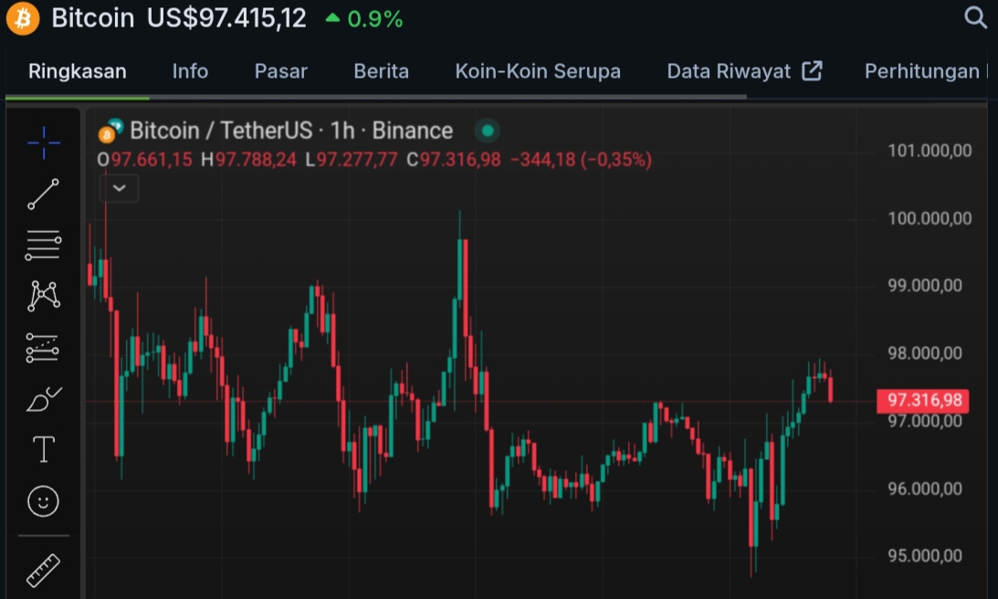 Today's Bitcoin (BTC) price is US$97,415.12 with a 24-hour trading volume of US$37,923,707,075. It shows a price rise of 0.73% in 24...