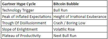 El entusiasta de Bitcoin, Michael B. Casey, publicó en 2016 lo que él considera el ciclo del precio de esta criptomoneda, relacionándolo con las etapas de adopción usuales para cualquier tecnología nueva según el ciclo de sobreexpectación de Gartner. En este análisis podemos ver que Bitcoin tiene una tendencia marcada a sufrir grandes burbujas (Casey cuenta 5 hasta esa fecha), cuyas etapas pueden bien asimilarse al ciclo de Gartner.