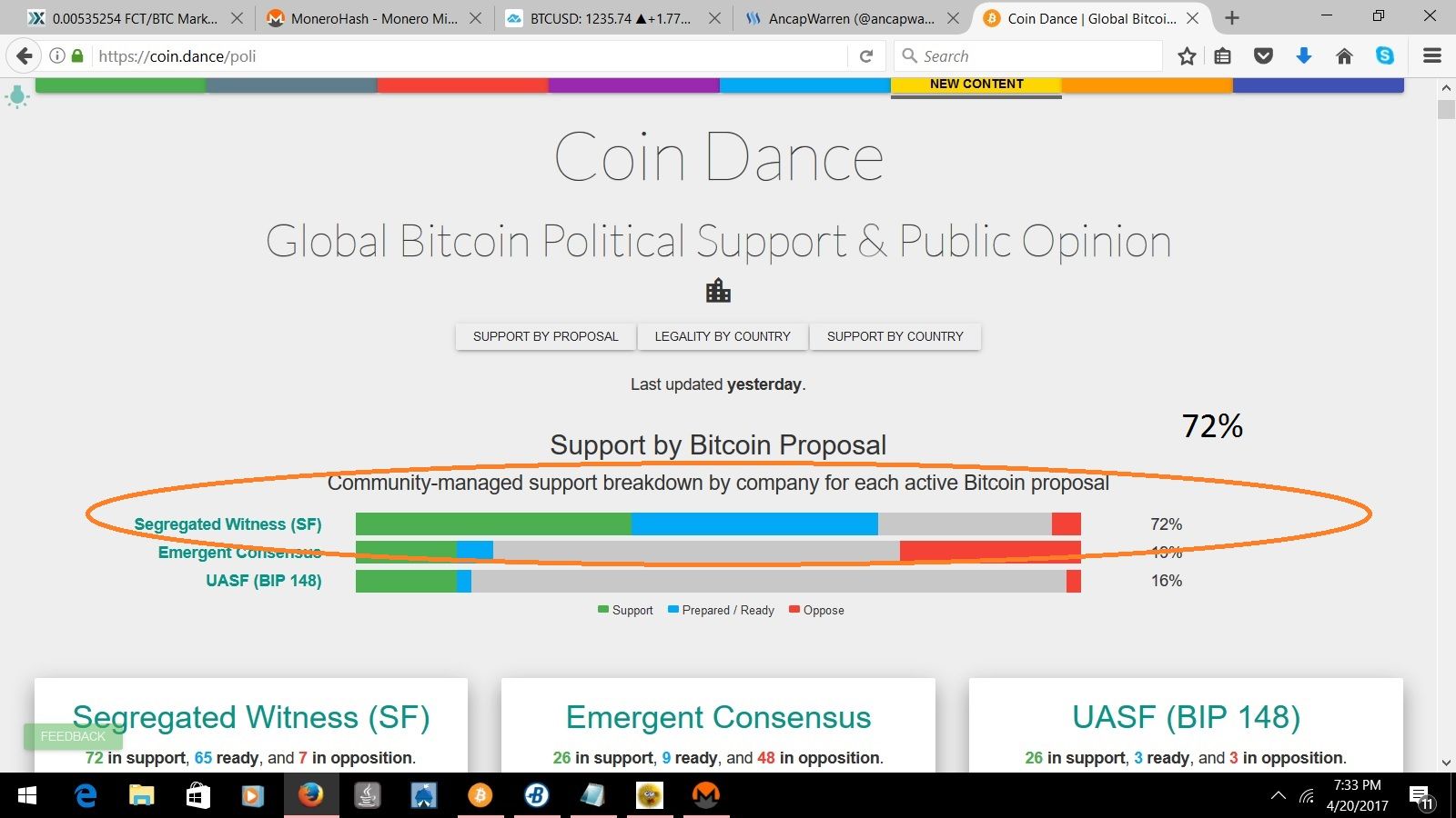 So, we are effectively being held hostage by one company....Bitmain, Antpool, Jihan Wu, and Roger Ver with Bitcoin Unlimited. Even though the picture below shows 72% consensus(and growing) among Bitcoin businesses and exchanges. That number grows to 88% if you add the user activated soft fork(UASF) BIP 148 crowd.