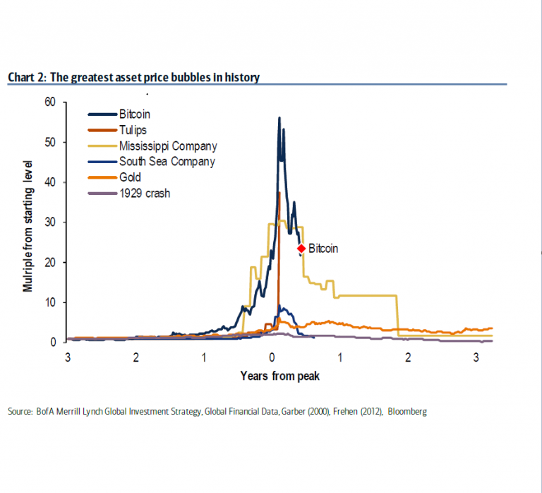 Según Bank of America, el Bitcoin superó la conocida especulación de los tulipanes holandeses, burbuja que creció 40 veces su valor, en contraste con el BTC, el cual aumentó su precio desde hace tres años en más de 60 veces. No obstante, la reciente corrección del BTC no fue la más grande de su historia, debido a que las subidas entre 2010 y 2011, 2013 y 2014, fueron más pronunciadas, y las caídas más duras, destacando el rudo 2014, el cual, luego del escándalo de MTGox, la tendencia a la baja duró casi todo el año, para luego recuperarse y seguir marcando nuevos máximos historicos.