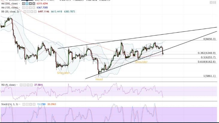 #BTC/USD has broken out of the rising wedge design, yet its drawback is topped by solid bull underpins close to 6348-fiat and 6255-fiat. Concerning now, we are near framing a close term Head and Shoulder design, with the head almost 6620-fiat and shoulder almost 6255-fiat. The left shoulder of current H&S is additionally the correct shoulder of the opposite H&S, which makes it a urgent level to look for as the value endeavors another drawback.