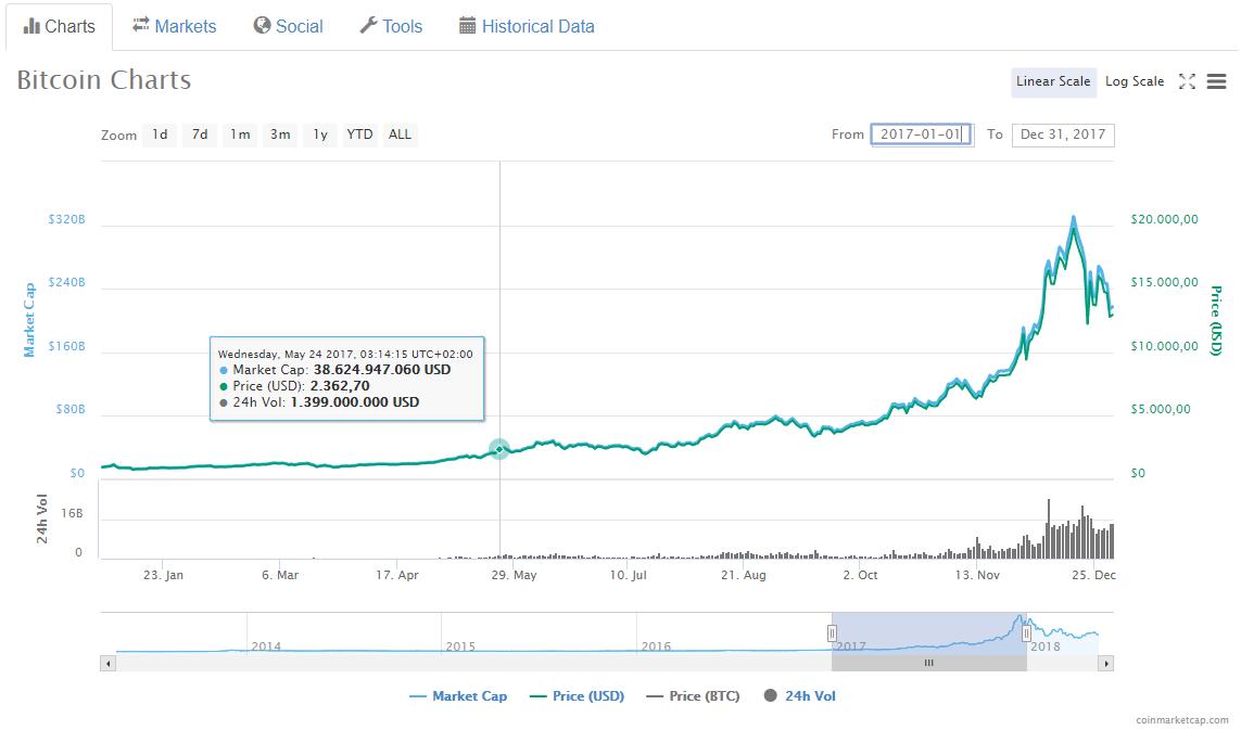The third consensus conference was held in New York from 22 to 24 May 2017. Over 2700 participants, 200 speakers, 75 sponsors and 50 media partners were part of the Blockchain event of the year. Brian Armstrong (CEO of Coinbase), Peter Smith and many others were among the speakers. All other data about the event from the year 2017 can be viewed here. At the time of the event there was also a slight increase, but the extreme thrust remained. As you can also find in the chart, the bitcoin price could rise sharply only weeks after the consensus conference.