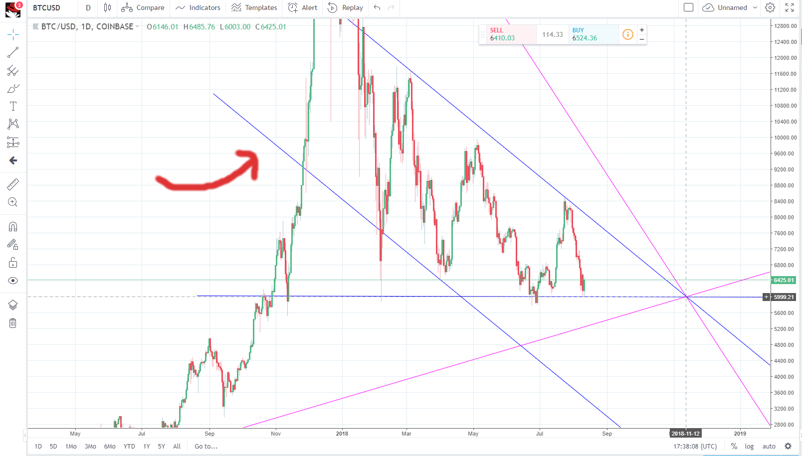 When you add this line and scale the price....ashmodz (57)in #bitcoin • 8 years ago Things start to look downward possibly. It bounced nicely off of 6003 though. Have a chill Saturday friends.. #crypto #blockchain #life
