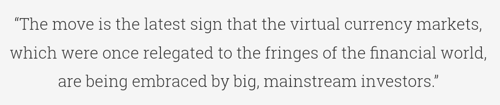 En mai, Intercontinental Exchange - la maison mère de la Bourse de New York - a révélé qu'elle est en train de développer un produit de cryptage qui permettrait aux investisseurs d'acheter directement Bitcoin. Parallèlement, Goldman Sachs a annoncé qu'il prévoyait également d'offrir Bitcoin Futures à ses clients.