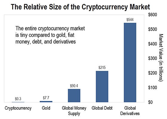 As you can see, the market value of the total cryptocurrency market is only $300 billion. That makes cryptos 25 times smaller than the gold market… 300 times smaller than the global money supply… 716 times smaller than the world’s outstanding debt… and 1,812 times smaller than the global derivatives market (which consists of options, futures, warrants, swaps, and forward contracts).