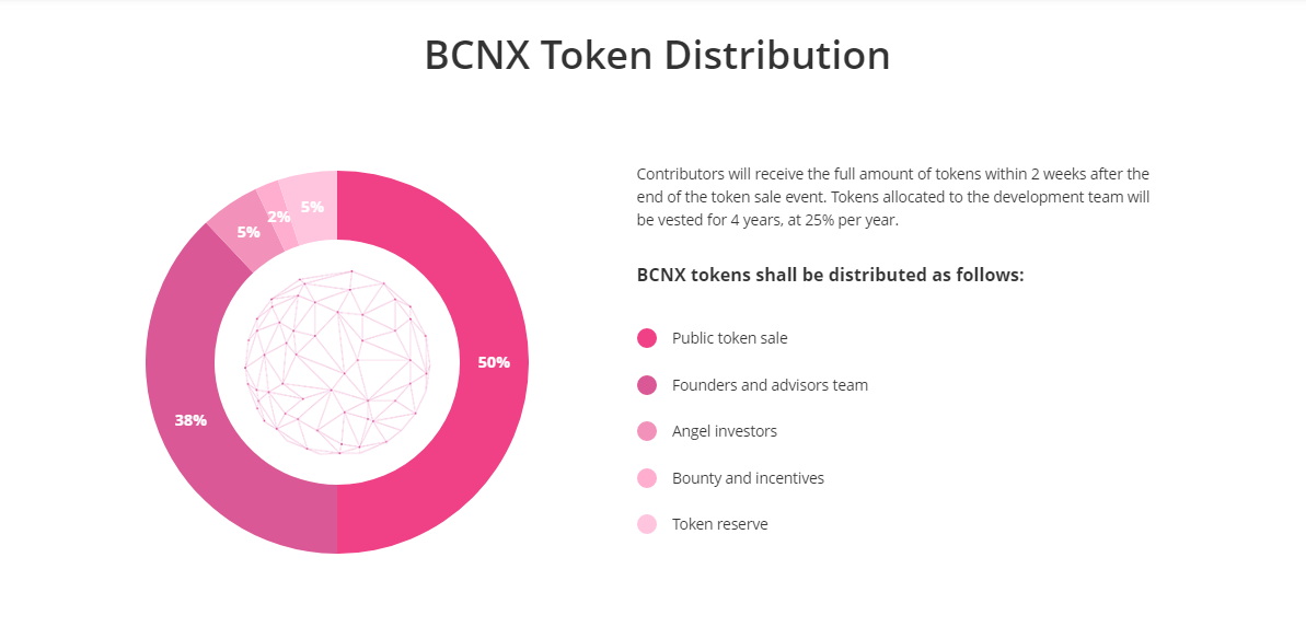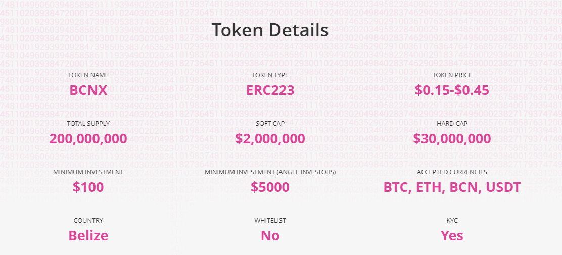 Bcnex works with the main token named BCNX. There will be really 200,000,000 (two hundred million) BCNX issued and the number will never augment. BCNX is the standard token ERC223 released on the Ethereum blockchain.