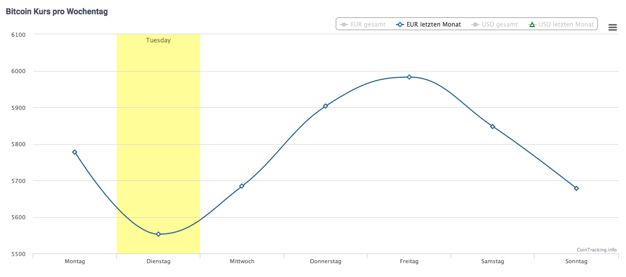 - Cointracking.info provides analysis through the average bitcoin price per weekday