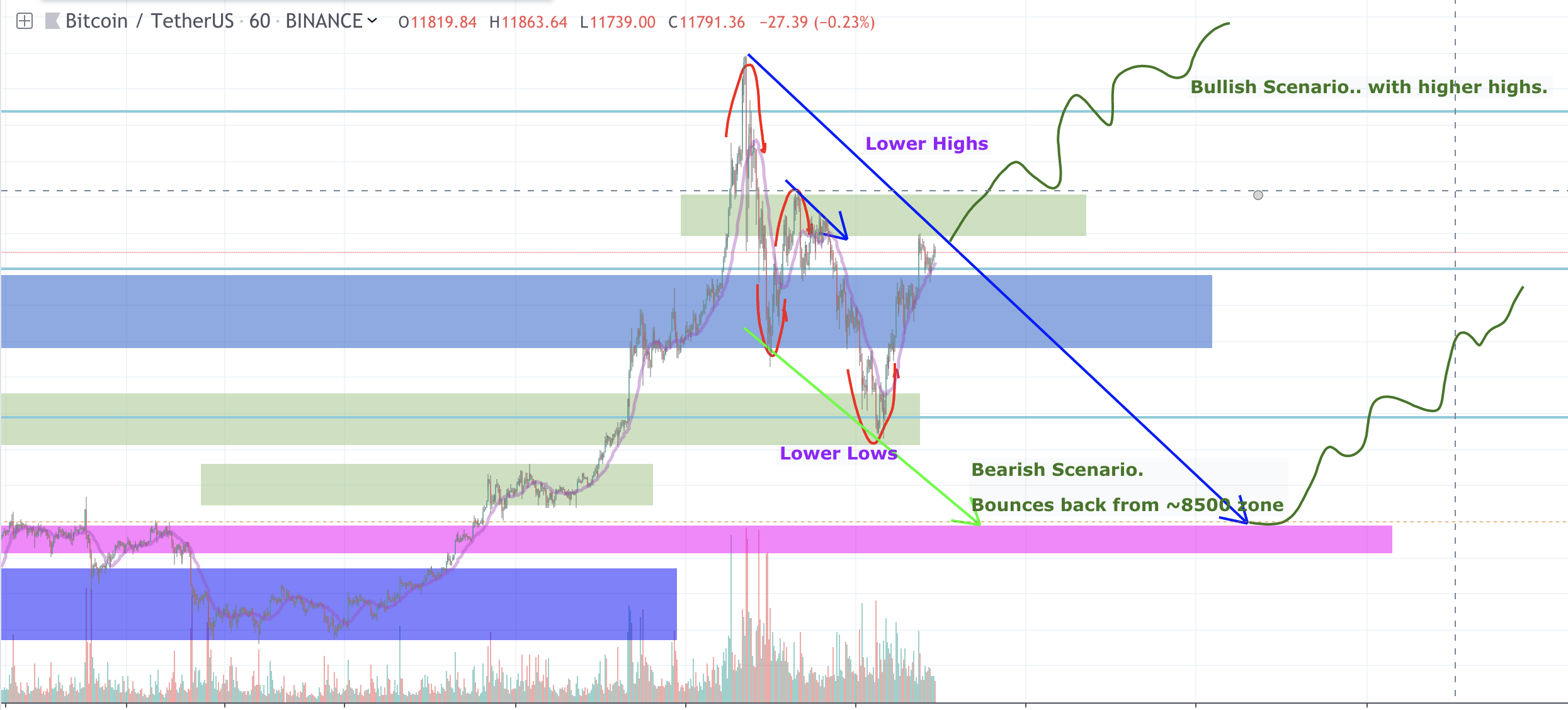 After the bull run up to 14K, now it's short term bearish, as it's forming lower highs and lower lows (2nd chart). But on a weekly basis(3rd chart), we are clearly on a bull market after the previous bear market ended in this summer. Bitcoin will most likely shoot a new record high (above 20K), conservatively speaking, by the beginning of next year (or early with another parabolic run). And in long term, bitcoin price will shoot 100K when bitcoin supply halvening happens by 2021 with the entrance of all the institutional investors.