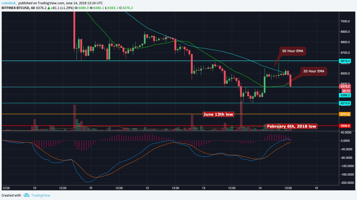 Resistance was hit at the previous support level of ~$6619 and prices have dipped to minor support ~$6368