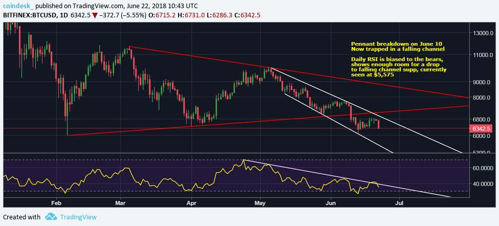 BTC hourly chart RSI shows oversold conditions, so we might be in for consolidation for a couple of hours before a drop to $6K.